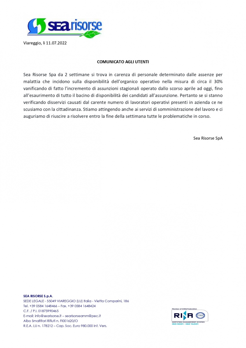COMUNICAZIONE CARENZA PERSONALE LUGLIO 2022